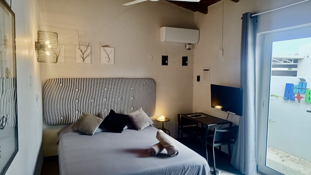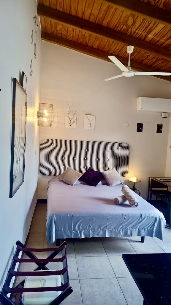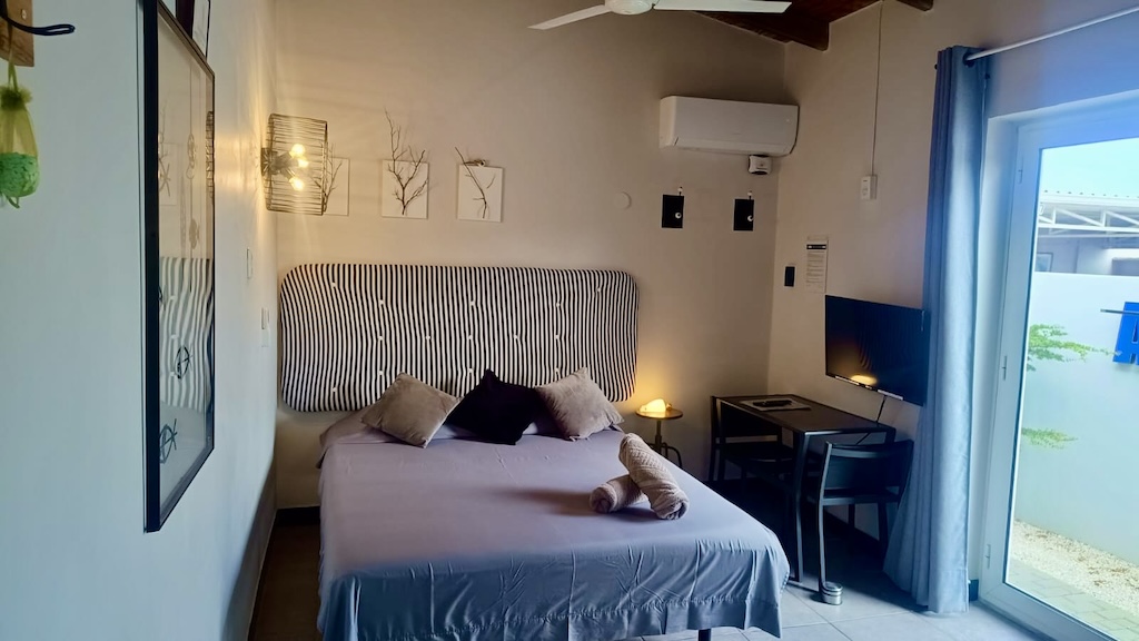 Our studio My Space has a private bathroom with shower, AC, a closet, a kitchenette with fridge, a small safe, Op Tv app international television, WIFI and a ceilingfan. It doesn’t have a private terrace like our other studios, therefore it is a bit more economical. Ofcourse bed- and bathlinen are included as are a coolbox and beachtowels. If you like to read, we offer a small number of books (mostly in English) with the “ take a book, leave a book” system. The key to your studio is obtained from a keysafe at the entrance.